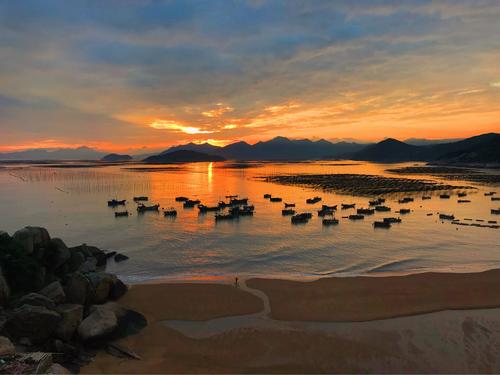 小皓海灘主要以沙質灘涂為主,漁排圍繞著一兩座海島呈環形狀,遠方貼著小皓村連綿的山脈。這里是攝影者來到霞浦一定要前往的一站,潮水漲落、季節變換、月落日升,每天的景色都大不相同。