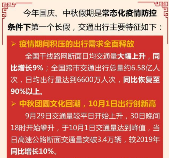 另外,9月30日,全國高速公路擁堵里程較往年上升159%,達到5336公里。10月1日,全國高速擁堵里程較歷史同期上升50.1%,高達9109公里。