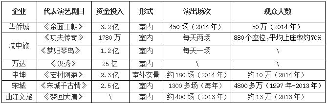 同樣進入較早的華僑城集團,在做深圳錦繡中華項目時便開始打造演藝演出。2012年,華僑城曾計劃將旗下旅游演藝業務單獨上市,其當時做的一份報告顯示,華僑城目前擁有專業演職人員2600名,上演原創節目26臺,累計推出各類原創節目57臺,累計演出63000場次,累計接待觀眾7600萬人次,已經發展成為全國演出節目最多、演員數量最多的旅游集團。