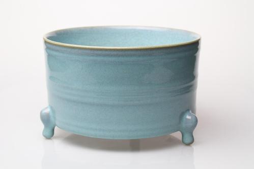 此器造型規整,釉呈淡天青色,柔和溫潤。它應與三足樽配套使用,用以承放三足樽。