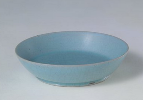 盤撇口,淺弧壁,坦底,圈足外撇。通體內外施天青色釉,釉面開細碎片紋。因采用“裹足支燒”,因此外底留有3個細小支釘痕。