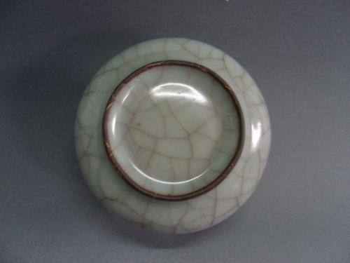官窯是宋徽宗政和年間在京師汴梁建造的,窯址到今沒有發現。官窯主要燒制青瓷,大觀年間,釉色以月色、粉青、大綠三種顏色最為流行。官瓷胎體較厚,天青色釉略帶粉紅顏色,釉面開大紋片。這是因胎、釉受熱后膨脹系數不同產生的效果。瓷器足部無釉,燒成后是鐵黑色,口部釉薄,微顯胎骨,即通常所說的"紫口鐵足"。這是北宋官窯瓷器的典型特征。 北宋官窯瓷器傳世很少,十分珍稀名貴。
