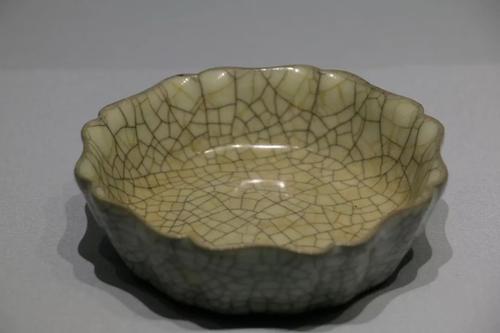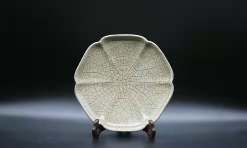 發生損壞的宋代哥窯青釉葵瓣口盤呈六瓣葵花式,通體施青灰色釉,釉面開細碎片紋。圈足露胎處呈黑褐色。此盤造型優雅、大方;線條富于變化,為宋代哥窯的代表作品。