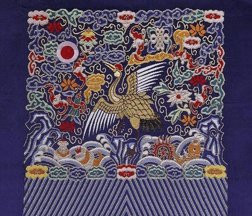 云錦是專為帝王將相、王妃公主們做服飾的,有著鮮明的宮廷文化的烙印。君權神授是封建君主專制制度的一種政治理論。歷代帝王自命“真龍天子”,受命于天,統治眾生。故而,皇帝的衣服藻飾華麗,服飾上大量使用神獸“龍”的形象。北京故宮博物院收藏的雍正皇帝云錦朝服,在石青色素緞地上,于前胸、后背、肩部織團花五爪正龍、腰圍行龍五,襞積前后團龍各九,裳正龍二,行龍四;披領行龍二,袖端正龍各一;通身五彩祥云,下八寶平水,海水江崖。龍袍上除表現惟我獨尊的天子尊位外,還隱喻著“一統山河”和“萬事升平”的寓意。文武官員的服飾則有著森嚴的等級差別,明代文武一般官服,按官品等級不同,顏色花紋各有區別。大官紅袍,中等青、綠袍,小官檀和褐綠袍。花朵也分大小,小官無花紋。更明顯的區別標志是補子,文禽武獸,胸背各一。