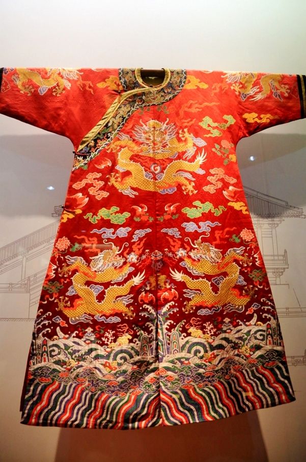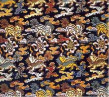 在中國傳統戲劇的舞臺上,凡有帝王將相、王妃公主出場,他們身上光彩奪目的服飾,總會讓人們的眼睛為之一亮。它們有力地烘托了人物,渲染了劇情氣氛。這些雍容華貴的戲劇服飾,是以明清帝王后妃和高官貴婦及千金們的服飾為藍本,經過藝術加工制成的。而這些古代帝王們的服飾,其中許多就是用南京云錦縫制而成的。所以在“南京云錦”上也就打上了深深的“階級烙印”,帝王服飾體現了“王權神授”的觀念,歷代帝王自命“真龍天子”,受命于天,駕臨人世,統治眾生,于是在服飾上大量使用傳說中的神獸“龍”的形象,非帝王不準用,以示君臨天下,唯我獨尊。