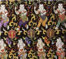 童子攀枝妝花清代用料。主體紋樣源自清代宮廷,后由朝廷賞賜給西藏達賴喇嘛,成為達賴喇嘛寶座上方的頂蓬裝飾,受人頂禮膜拜。童子手持蓮花,作攀登狀,寓意“年年”好合(“蓮”的諧音)、飛升騰達、五子登科。同時,“蓮”又諧音“憐”,古語中可憐即可愛之意。童子形象生動可愛,表情細膩傳神,紋樣色彩豐富高雅、線條柔婉飄逸,是云錦藝術中的珍品之一。