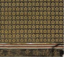 庫緞是在緞地上起本色花。花紋有明花和暗花兩種。明花浮于表面。暗花平板不起花。庫錦,又名織金。其花紋全部用金線織出。傳統的織金圖案,大多采用小花紋,以充分顯金為其特色。