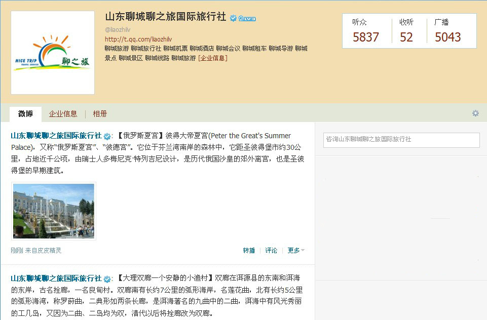 聊之旅國際旅行社騰訊官方微博:http://t.qq.com/liaozhilv聽眾突破5000人