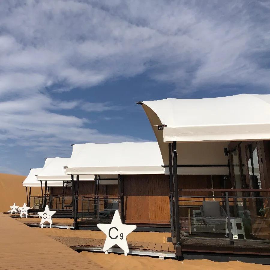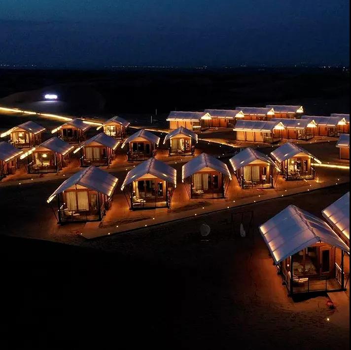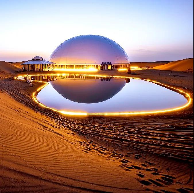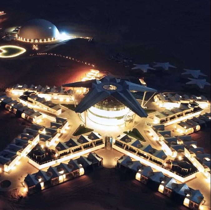 沙漠星星酒店沙漠星星酒店是國內(nèi)首個(gè)以沙漠觀星為主題的酒店,它坐落在寧夏省中衛(wèi)市沙坡頭旅游度假區(qū)內(nèi),以五角星形狀規(guī)劃設(shè)計(jì),從空中俯瞰正形如一顆顆星星。遠(yuǎn)遠(yuǎn)看到的第一個(gè)建筑則是一個(gè)巨大無比、白色的半球體,這是酒店的標(biāo)志性建筑——星星劇場(chǎng)的穹頂。及至近前是起伏沙丘上的一棟棟設(shè)計(jì)感十足的精致木屋鱗次櫛比;一面全是玻璃幕墻的觀景房遙遙相對(duì);還有星球穹頂?shù)挠^星房;“半個(gè)太陽的驚喜”落日餐廳。餓了,就來一頓獨(dú)具特色的沙漠晚餐;累了,就住在星星酒店,開啟“躺在床上數(shù)星星”的全新旅游方式。