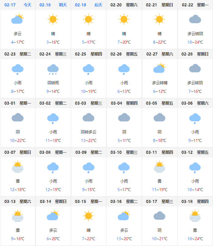 根據中央氣象預報顯示,2月17日-3月18日,婺源氣溫逐漸升高,晴天多云為主,溫度保持在9-18℃左右,此種溫度能適當加速油菜花的生長。正適合踏春賞花!
