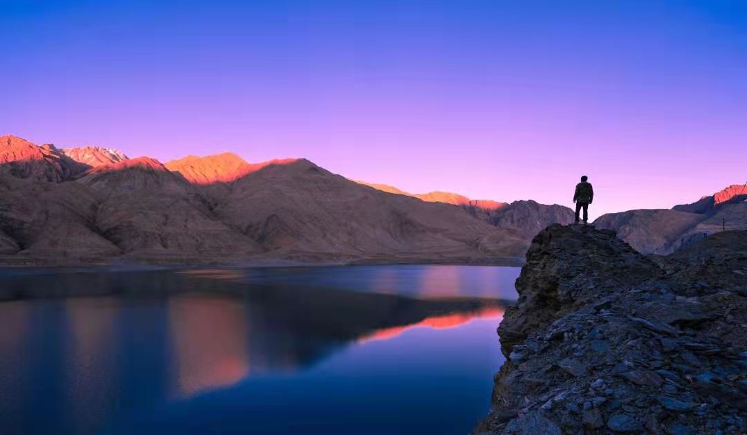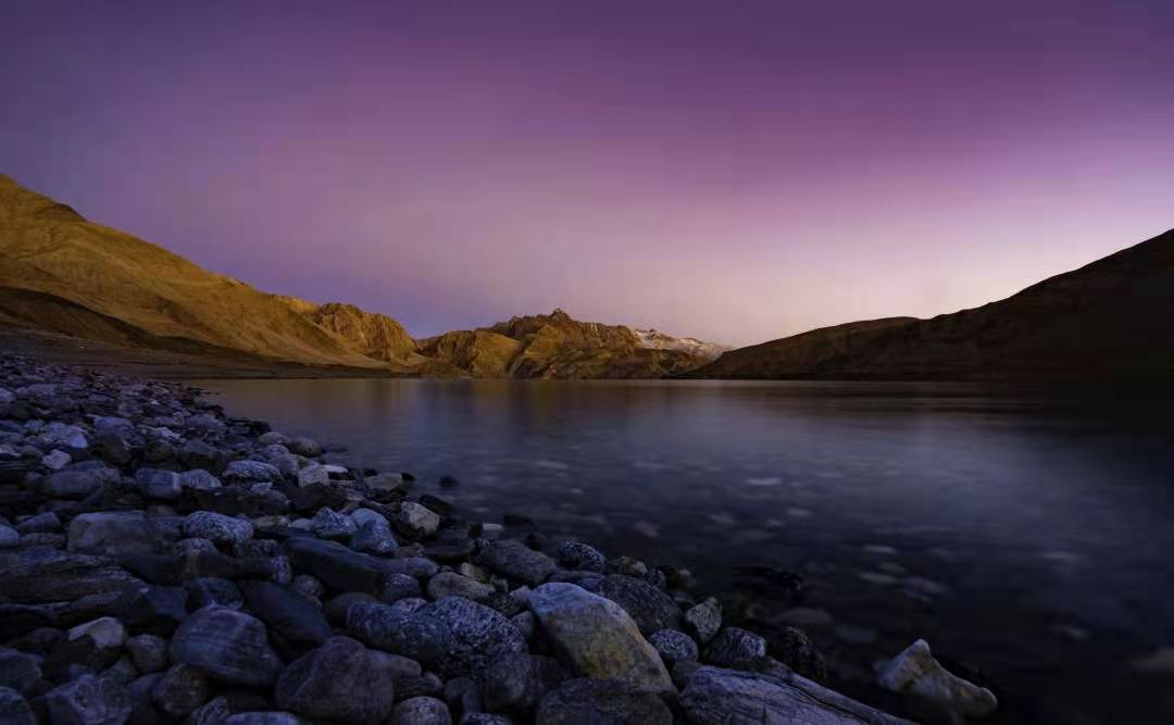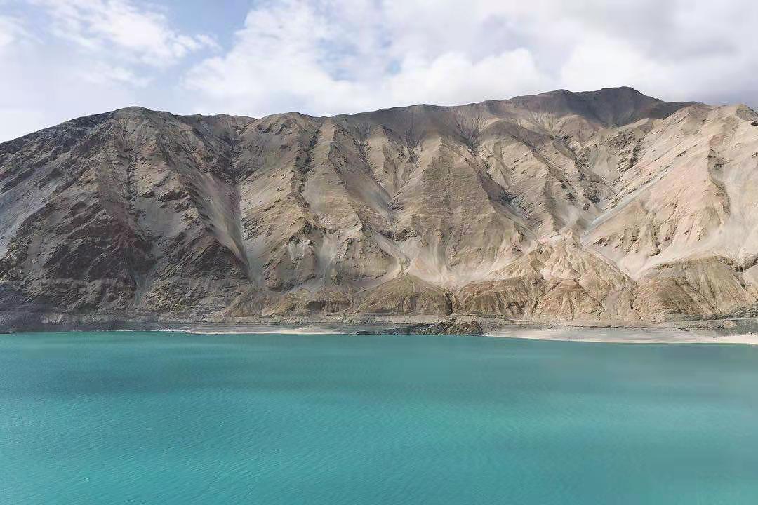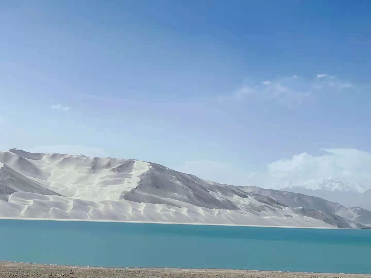 車子行進(jìn)在海拔三千多米的【蓋孜峽谷】中。喀喇昆侖公路像一條玉帶,沿著蓋孜河在蓋孜峽谷中穿梭著,眼前的景色又變成了綿延不絕的荒山雪嶺。此時(shí)突然出現(xiàn)的美麗湖泊便是【布倫口白沙湖】湖水在帕米爾高原潔靜的陽光下,閃耀著金屬般的光澤。湖水在天空、白沙和雪山的綜合作用下呈現(xiàn)出一種別樣的藍(lán)。