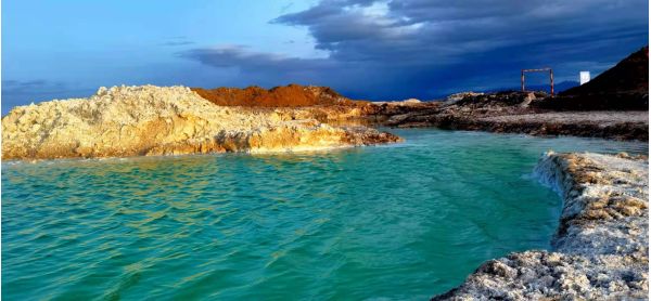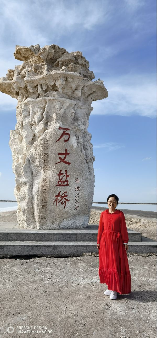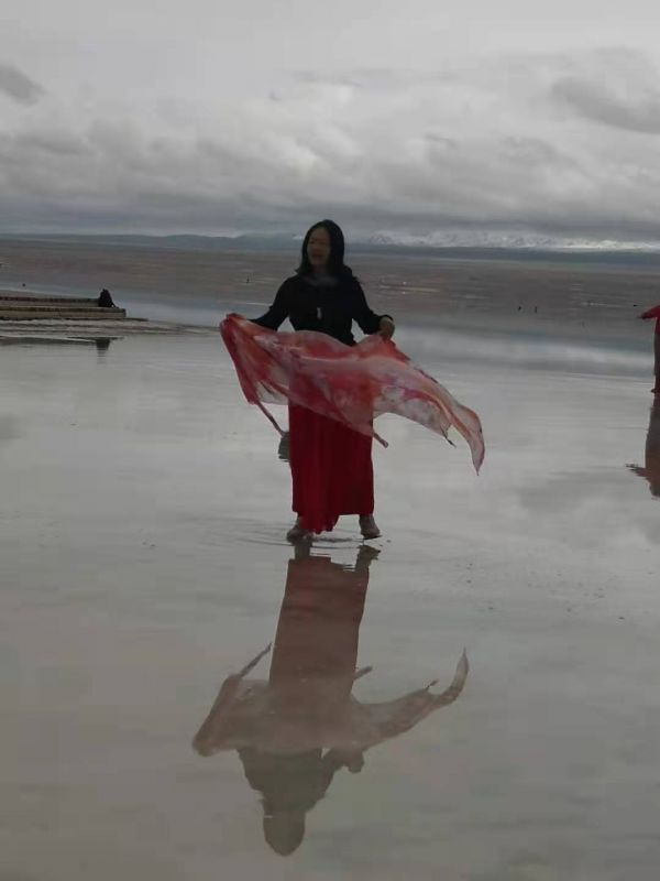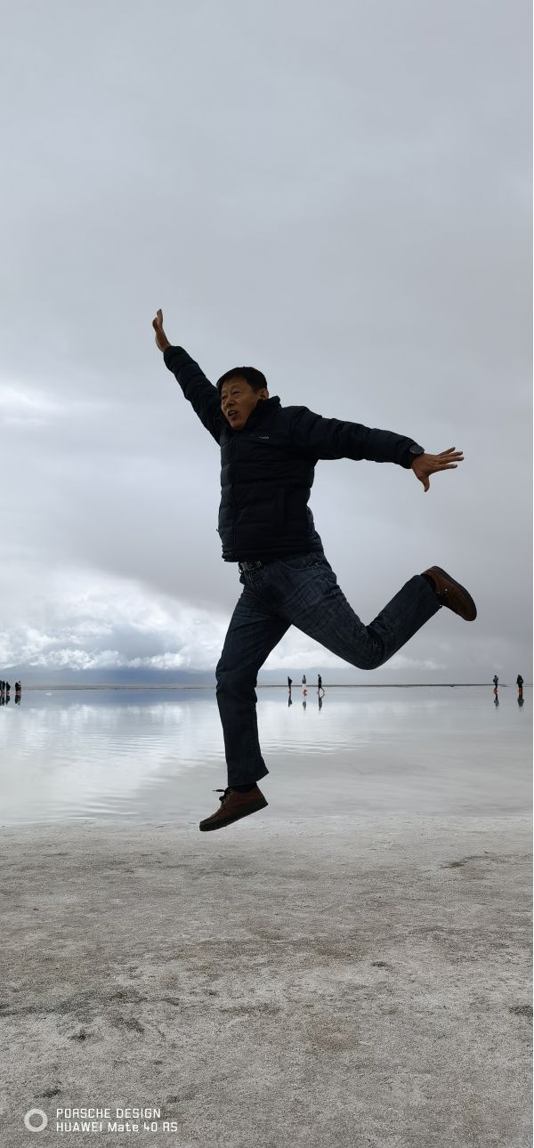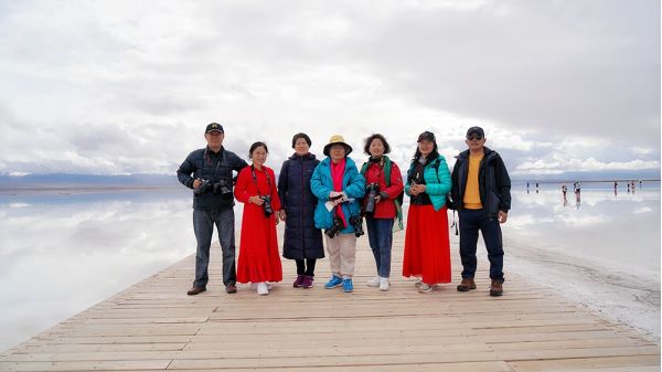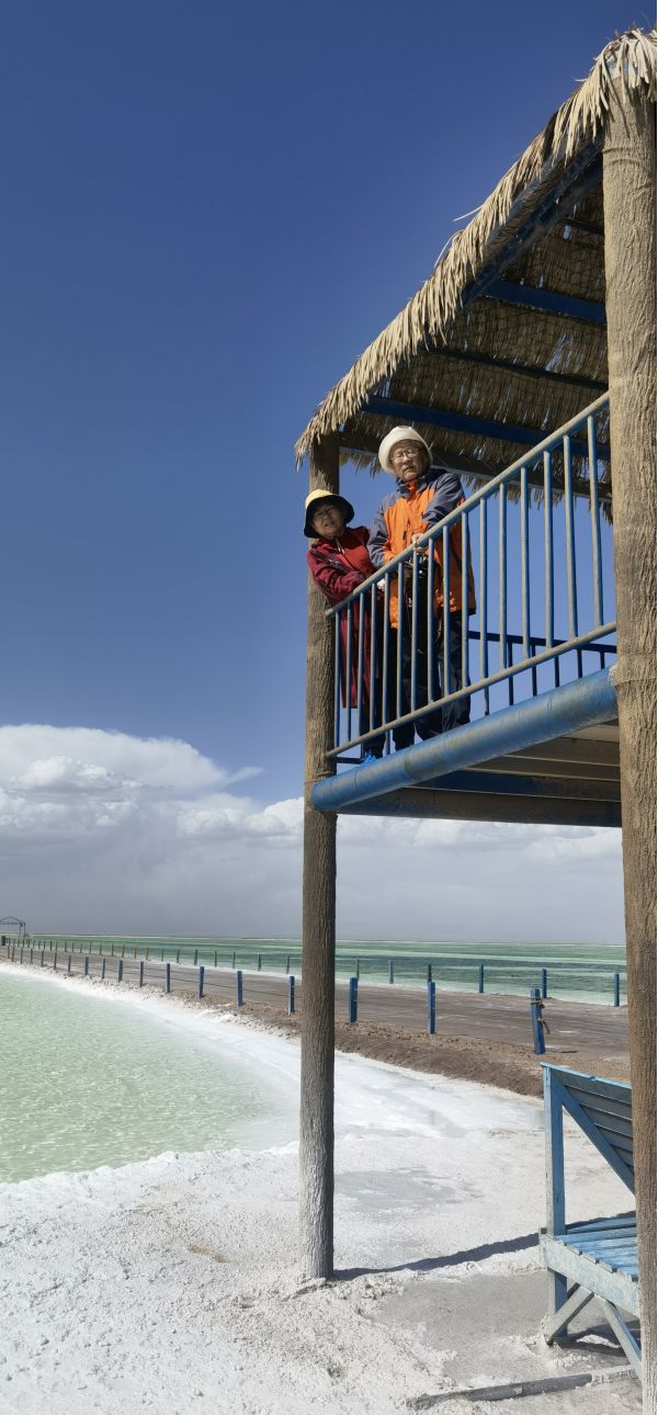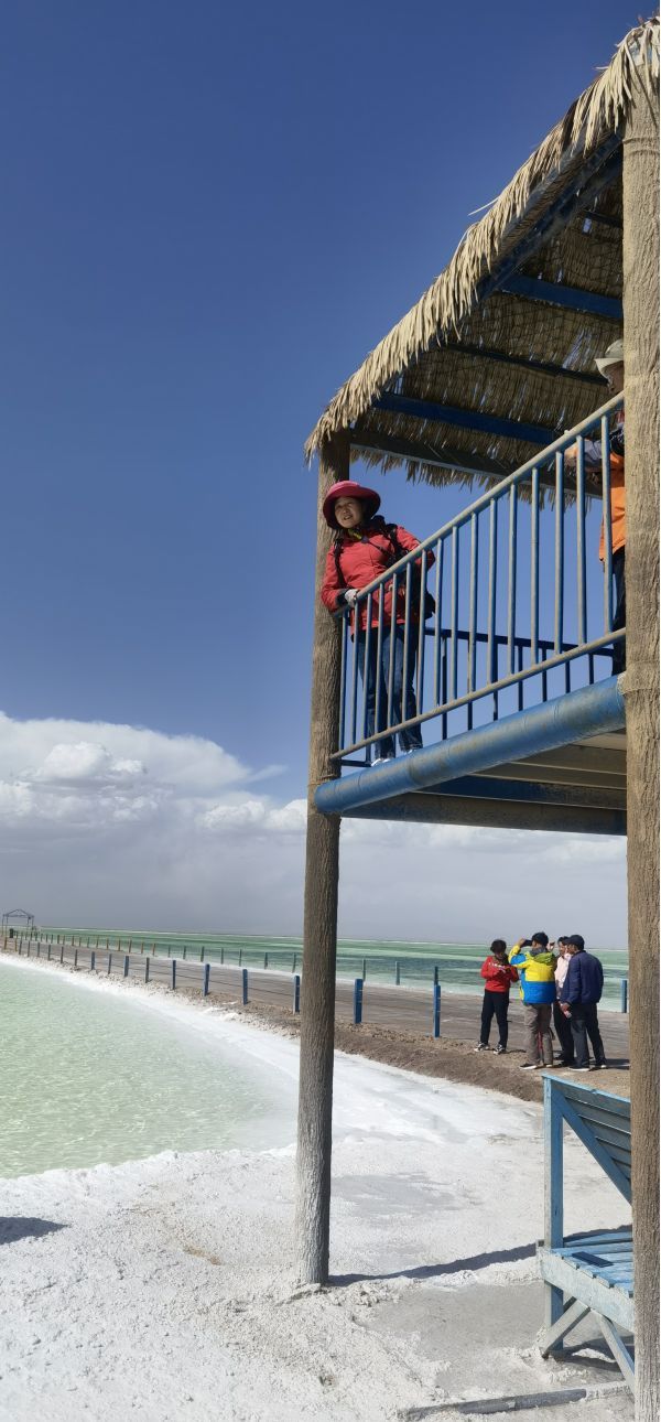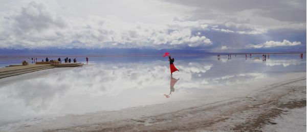 時速大約相當于人的走路的兩倍到三倍,咣當咣當倒是不耽誤欣賞一路風景。目的地就是當年鹽場采鹽的鐵路的盡頭。鹽水很淺,風平浪靜,翠綠的鹵水倒影著遠處的雪山,風景剎是美麗,水也就是能沒到腳面,租他的膠鞋和紅色的裙子可以到鹽湖里面拍攝。紅色的裙子倒影非常漂亮,遠處的云彩黑白相間。一朵一朵相擁而來,紅色的裙子,翠綠色的湖水,藍色的天空白色的雪山,真是如入仙境,大家操作無人機上下左右拍了無死角,兩個多小時瞬間過去,說好的是5點返程,6點了大家還意猶未盡,流連忘返。