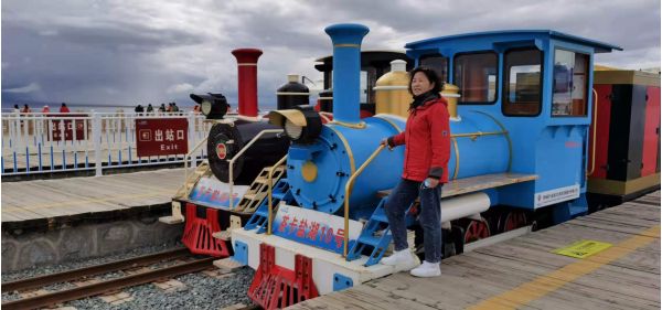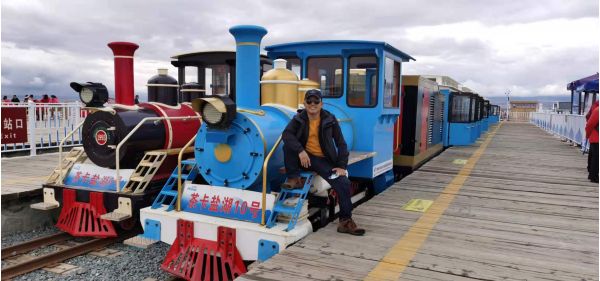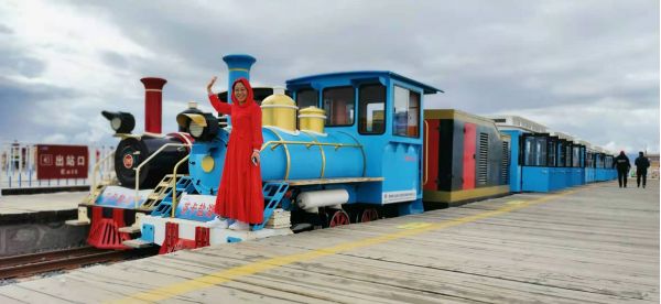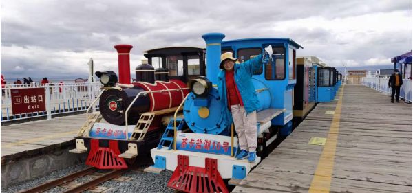 鹽湖最美景色離進口還有4—5公里,大家都坐上了一輛小火車,鐵路是原來鹽礦采礦用的,現在搞起了旅游,車票每人60元,小火車大約有10節車廂吧,每個車廂有32個人,每趟就是19000元,搞旅游可能比開鹽礦更賺錢。