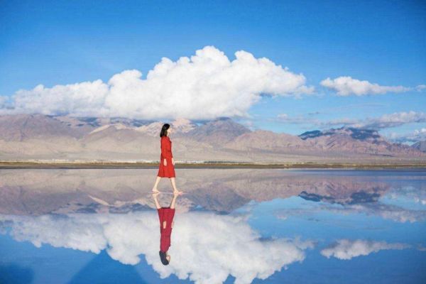 最佳拍攝時段是一天中早晨9點左右,下午4點以后,白色的湖倒影出湛藍的天空,棉花糖似的白云,以及暖暖的夕陽。這個時間段人比較少、光線條件也合適。到中午時分,大批量的游客就陸續到達了,很難找到沒人的背景,而且強烈的陽光直射,拍不出倒影感,此時的效果反而最差。還有就是是雨過天晴的傍晚,會干凈、柔和一些。另外,要等到無風或者微風的時候,因為風太大,水面波動,也是沒有倒影效果的。