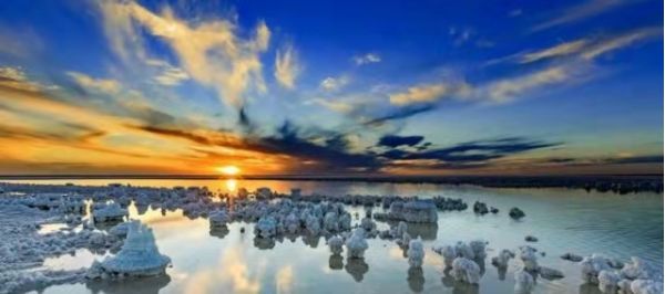 因為氣候炎熱干燥,湖水的蒸發量遠遠高于降水量,湖內便形成了高濃度的鹵水,然后逐漸結晶成了鹽粒。而鹽花是鹽湖中的鹽結晶形成的特殊形狀的結晶體,由于結晶時的溫度,氣候,時間長短,濃度不同等原因,形成了各式各樣,萬千變化的美麗鹽花。生命的禁區,萬物俱寂,但是唯有“鹽花”開的最旺,它就是大自然賜給人類的絕妙作品,日夜看守這片凈土。這些鹽花無需人工的雕琢,形態各異,有的宛如貝殼,有的宛如樓臺,一叢叢,一片片,一簇簇地立于鹽湖中,把鹽湖裝飾得如仙境一般。