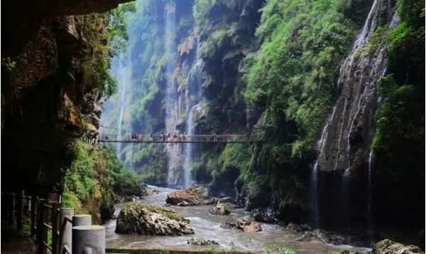 下午:后乘車前往游覽國家 AAAAA 級景區【大七孔】 (游玩時間不少于 2 小時);大七孔是以原始森林、峽谷、 伏流、地下湖為主體的景區,沿著恐怖峽打狗河直下,可見吊橋,右邊的棧道一面靠山,一邊臨水,蜿蜒曲折,凹凸不 平。最為震撼的還是走過棧道的三分之二處,有一橫跨河兩岸的天然巨巖,是喀斯特是貌奇觀之一,俗稱天生橋,被專 家們譽為 “大自然神力所塑的東方凱旋門”,仰觀橋孔下,只見巨型鐘乳懸掛,橋腳、橋側的裂隙石縫長出綠石草叢灌木,藤蘿花卉纏裹橋身,真是滿目琳瑯、五顏六色的天然大彩橋。