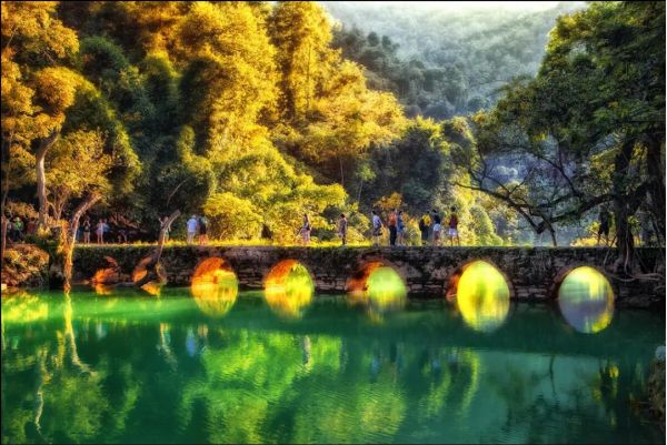 早餐后前往國家AAAAA級風景區【小七孔】(游玩時間約4小時);景點之間需換乘電瓶車(電瓶車40元/人,景區保險10元/人,費用自理)小七孔景區因一座建造于道光十五年間(1836年)的【小七孔石橋】而得名;景區被稱之為“超級盆景”,集山、水、洞、林、湖、瀑布等為一體,在長不到2公里的峽谷內,起迭著68級瀑布,順贄而下,奔瀉而去【68級跌水瀑布】。【拉雅瀑布】精巧醉人,水珠飛濺;而長不到600米之水上森林,樹根盤在錯石上,清澈的水流沖刷著青石,行走于其中,若身臨瓊瑤仙池。拱壩截水而形成的【臥龍潭】水從壩頂傾瀉下來,如一道銀色的水簾掛在眼前,壯觀而又秀美,水面經過吸收、反射和折射,呈現各種藍色,真是美如仙境。