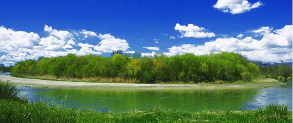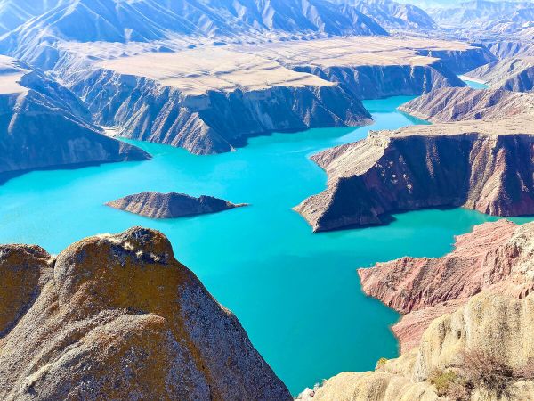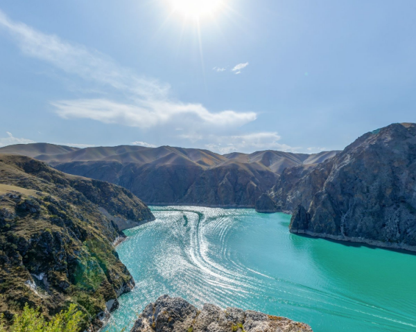 肯斯瓦特水庫位于瑪納斯河上游,距石河子60多公里。水庫大壩將瑪納斯河水匯集起來,形成一個高山湖泊,放眼四望,湖水蜿蜒于群山峻嶺之間,曲折環繞?見盡頭,河水純凈翠綠,平靜如鏡。登高望?,令人心曠神怡。