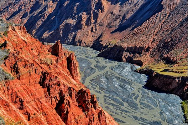 河水沖出天山后,切割獨山子西南方向傾斜平原形成的神奇風光峽谷,峽谷兩岸的階地歷歷在目,至少可分9級,階地面上是荒漠草原,生長著蒿類、針茅等。在獨山子境內奎屯河流經獨山子大峽谷之中峽谷近南北走向,峽谷古幣懸崖陡峭,谷底流水時分時合,谷肩地面是荒漠草原,站在谷肩處遙望峽谷,呈現在眼前的是一幅典型的大峽谷景象。 天山雪水及雨水流下來經過這里的土壤形成的沖積溝壑,在谷壁雕鑿出這些奇特景觀。峽谷是從山腳下開始,在草原上形成層次分明土壤層。但顏色主要還是以灰色、黑色為主。 峽谷的雪水很大,但是經過這些土壤的時候,攜帶著泥沙水變得很混濁。