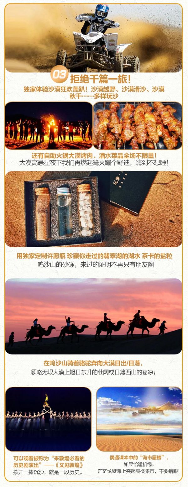 晚上在敦煌來一場絕無僅有的沙漠轟趴盛宴,沙漠越野、沙漠摩托、刺激滑沙、古城打鐵花……花樣玩法,玩累了咱們就坐地品嘗特別贈送的沙漠BBQ,酒水菜品全場不限量,大家圍繞著篝火舞蹈,聞著燒烤的炭火香,暢飲著啤酒,品嘗已然備好的燒烤,在鳴沙山的夜里熱情似火燃燒整個大漠!