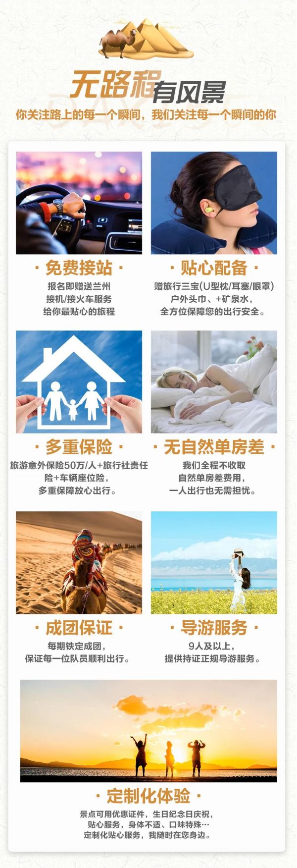 接站服務:免費提供蘭州市區拼車接機/接火車服務,接機/接火車的工作人員會在您出發日期前一天21:30之前向您推送消息并與您聯系,如果超過時間沒有接到任何通知,請及時與領隊或報名處聯系。(節假日用車人數較多情況下客人等待時間可能會延長;我方會安排臨近航班拼車接機接站,如遇其他客人航班火車延誤晚點情況,等待時間可能會延長,敬請諒解)