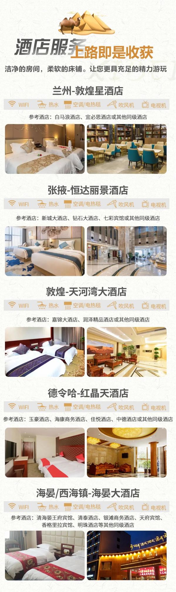 l 敦煌:天河灣大酒店、嘉錦大酒店、潤澤精品酒店或同級