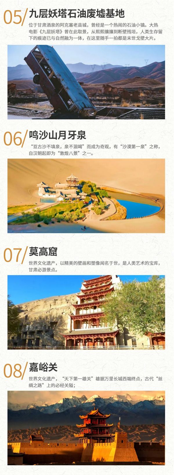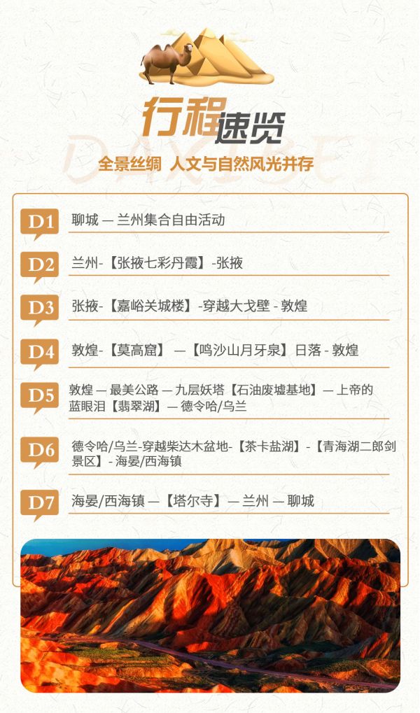 1. 敦煌莫高窟景區自2015年6月起實行數字展示中心數字洞窟展示和莫高窟實體洞窟體驗的預約參觀模式,每天限6000人參觀,團隊參觀時間嚴格按照莫高窟預約場次進行,因此,敦煌段景點參觀順序會根據莫高窟時間進行調整或同團客人安排不同時間游覽,敬請配合。