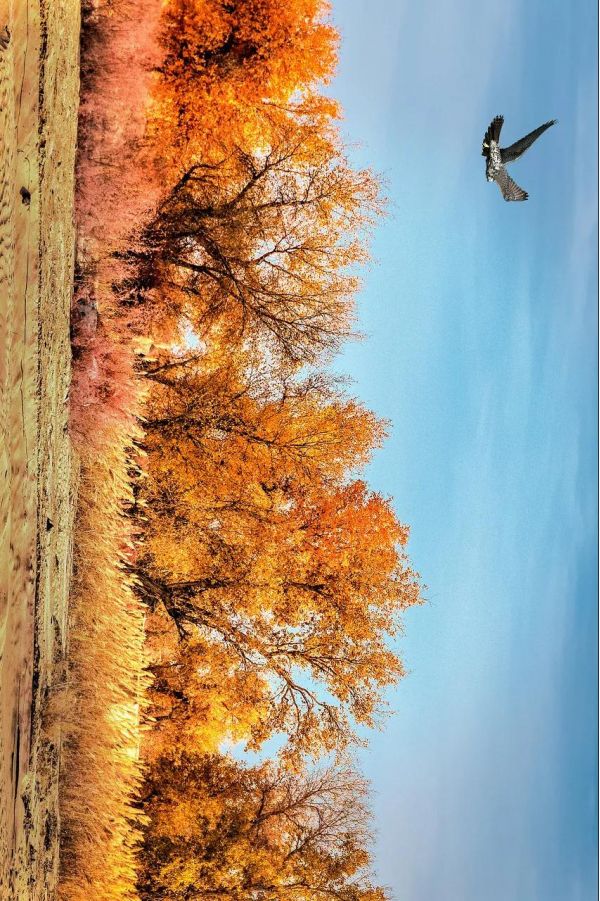 蘆葦蕩與胡楊樹葉一同飄蕩,有些枯黃的顏色倒襯出了胡楊的爛漫。