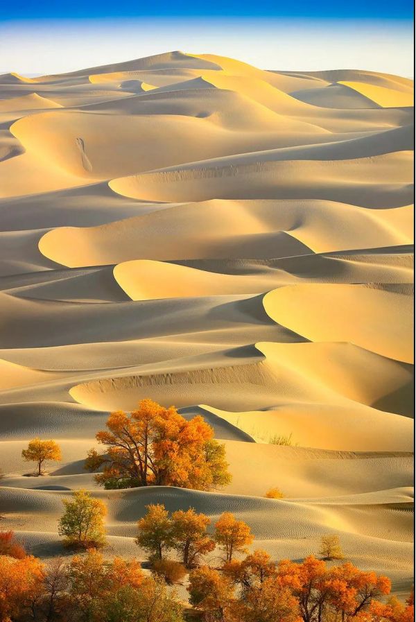 深秋就這么裹挾著顏料來了。她濕潤了畫筆,蘸著水彩,慢慢地將綠色一點點涂成了黃色。 滑滑、暖暖的細沙揚起,我又走進了一排排金色夢鄉。