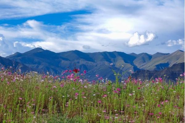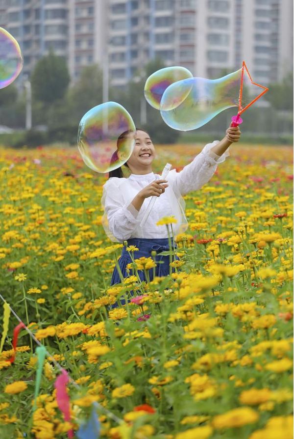 花海中可以看到向日葵、波斯菊、一串紅、步步高、格桑花……陣陣微風拂過,散發著淡淡的清香。
