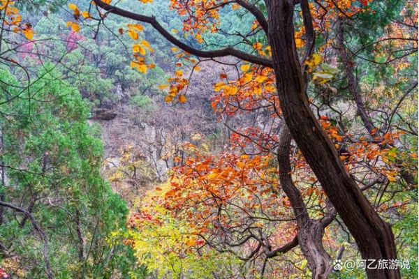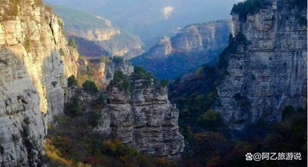 而龍洞山的秋季也足以稱得上“壯美”青松翠柏間,黃櫨如火焰般綻放著熱情,高崖絕壁的密林間層林盡染。山色五彩斑斕,絢麗多姿,完全不遜于紅葉谷,不禁讓人感嘆大自然調色盤的神奇。