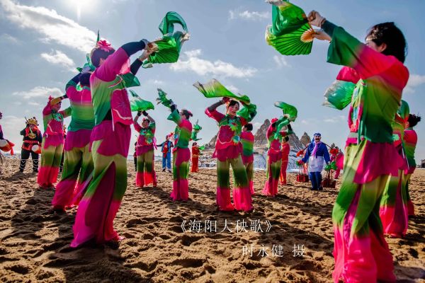 海陽大秧歌是山東省三大秧歌之一,是民間社火中的舞蹈部分,流行于山東半島南翼、黃海之濱的海陽市一帶。海陽大秧歌是一種集歌、舞、戲于一體的民間藝術形式,它遍布海陽的十余處鄉鎮,并輻射至周邊地區。海陽大秧歌素以粗獷奔放、感情充沛、風趣幽默的表演風格著稱于世。在表演形式上,分大場子和小場子兩種,大場子是群舞,鑼鼓鏗鏘、萬馬奔騰,宛若大河滔滔。小場子多是雙人舞、多人舞,恰似小橋流水,一波三折,美不勝收。海陽大秧歌獨具的優秀的民間藝術特色和濃郁的生活氣息,吸引了大批藝術家、學者及國內外游客前來學習、觀賞。