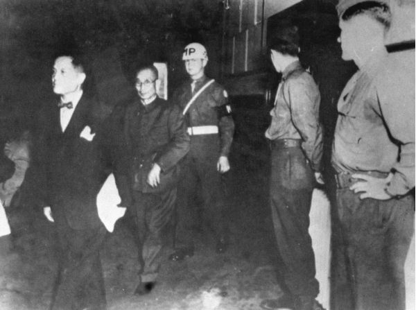 這是當年在南京制造大屠殺的主犯華中派遣軍司令松井石根(左二)被處決。新華社發