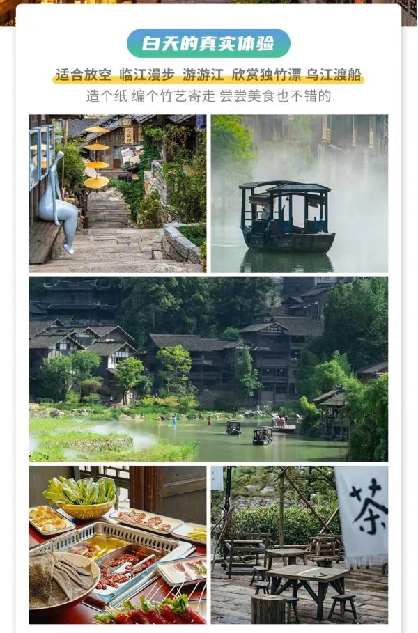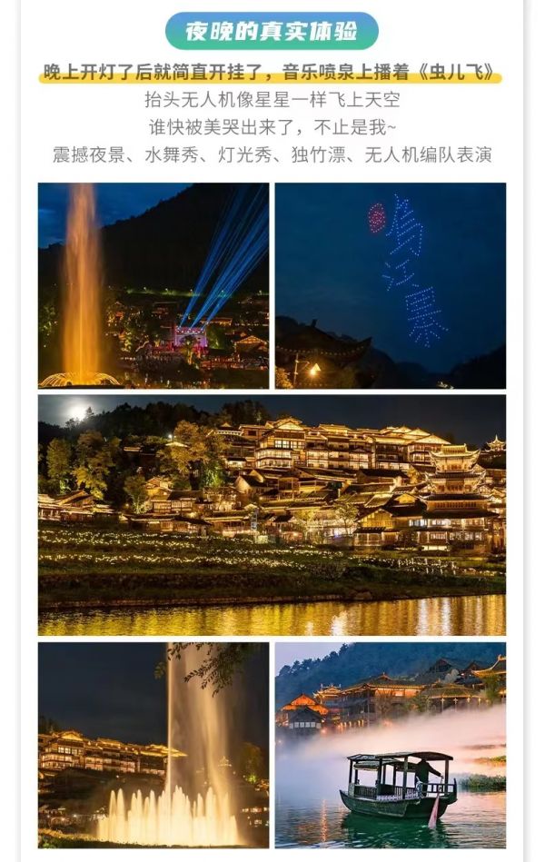 4.保證入住網(wǎng)紅國(guó)際度假區(qū)——烏江寨,震撼夜景、水舞秀、燈光秀、獨(dú)竹漂和無人機(jī)編隊(duì)等表演。