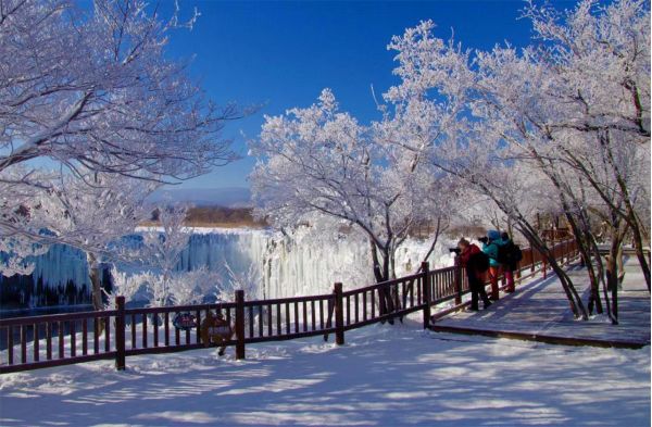 火山熔巖堰塞湖——鏡泊湖到冬季可形成厚達兩米、寬達數百米的冰瀑,似冰山聳立,是中國規模最大的冰瀑布。冬日的鏡泊湖景區黑龍潭周圍霧凇連綿數里,冬雪輕盈與靈動、綿柔與細膩,巧妙地與山、石、松相結合。“