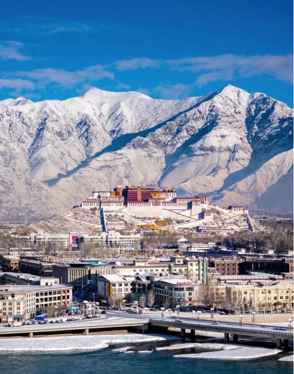 時至今日,距離初建已過去1300多年,布達拉宮宏偉壯觀的氣勢,在拉薩城市的不斷擴建中歷久彌新,從拉薩河畔望去,水晶般澄澈的空氣中,雪白的宮墻托起赭紅的宮殿,像夕陽越過雪山,那是雪域最美的顏色。