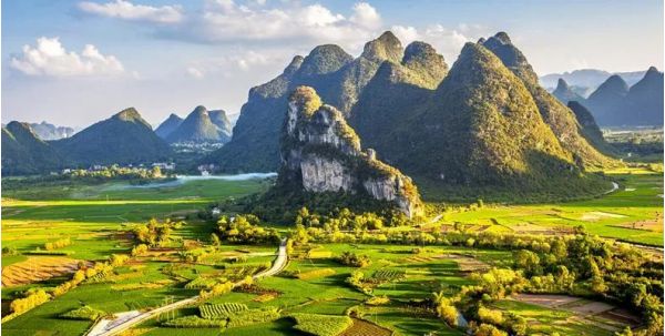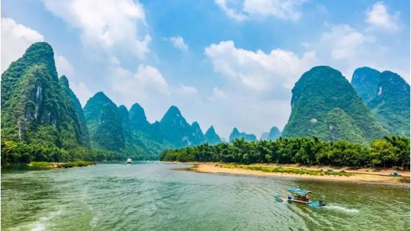 桂林山水甲天下,陽朔山水甲桂林。百里漓江、百里畫廊,兩岸山峰清秀迤邐,連綿起伏,形態(tài)萬千。水如同綠色的翡翠,清澈透亮。