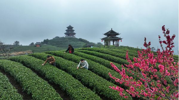 春暖花開,萬物復(fù)蘇。近日,廣西三江侗族自治縣八江鎮(zhèn)布央村仙人山茶園內(nèi)桃花迎春怒放,春茶初露嫩芽,游客愜意采摘,與山上的特色廊亭、縹緲云霧相互映襯,構(gòu)成一幅迷人的春景圖。