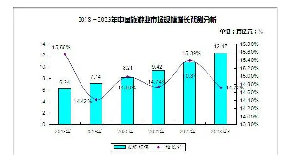 2023年中國旅游市場高速增長,入出境市場平穩發展,供給側結構性改革成效明顯。從2012-2017年旅游行業數據來看,全國旅游收入保持著兩位數穩定增長。2014年全國旅游收入達3.73萬億元,同比增長25.4%,達到近幾年來增速峰值,2015年增幅相對有所放緩。隨著近年來,政府大力發展全域旅游、冰雪旅游等,2015-2017年中國旅游業收入增速不斷提高。2018年全國旅游收入將達6.24萬億元,增速約增至15.6%,2023-2028年中國旅游行業市場深度研究及發展前景投資可行性分析報告預計到2023年全國旅游收入將達到12.47萬億元 ?