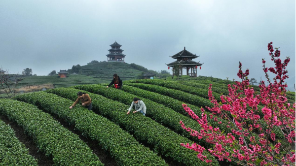 近日,廣西三江侗族自治縣八江鎮布央村仙人山茶園內桃花迎春怒放,春茶初露嫩芽,游客愜意采摘,與山上的特色廊亭、縹緲云霧相互映襯,構成一幅迷人的春景圖。