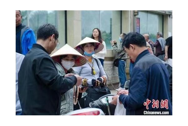 “我剛從越南過來,請幫忙開個張。”范氏香用一口流利的中文力爭早市“開門紅”,并向記者展示她的邊境通行證,她的單肩挎包里裝有紅木、黑檀、沉香等不同材質的手串,手上也戴著數串向游客展示。范氏香說,她恢復這項營生已經十來天,前一天賺了100多元(人民幣,下同)利潤。