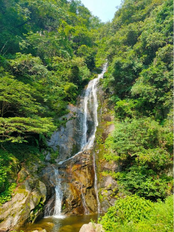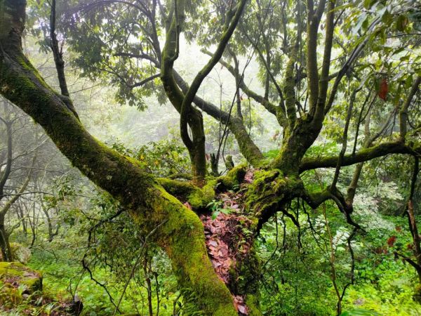 在觀景臺的另一頭,古樹林所在的山頭山巒清秀,山上綠蔭成林,古柏繁茂且分布密集,極目之處,約89棵古樹姿態萬千,枝葉繁茂,樹干布滿青苔好似走進仙境,山野間呈現如美畫景。