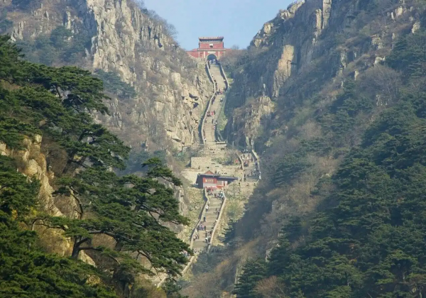 泰山十八盤是泰山登山盤路中最險要的一段,共有石階1827級,占地8平方公里,是泰山的主要標志之一。十八盤在對松山北。高阜之上,雙崖夾道,舊稱云門,今名開山,為清乾隆末年改建盤道時所辟。十八盤自此而始。開山北為龍門,舊有龍門坊,后毀。西巖有清道光年間魏祥摹刻狂草“龍門”大字。坊址東為大龍峪。前為新盤口。明萬歷年間,參政呂坤跨澗建渡天橋,并順龍峪上源修新盤道,直達碧霞祠南神門,登岱頂者上下為方便。橋與盤道均毀于清乾隆年間。新盤口北兩山陡立,東為飛龍巖,西為翔鳳嶺,中有一線天,名石壁谷。谷中上有南天門,下有升仙坊,由十八盤相連。南天門恰處于谷口,是泰山古建筑充分利用地理環境,以人工之力突出和美化自然環境的典范,是泰山的重要標志物之一。石壁谷兩側有“天門長嘯”“層崖空谷”“天門云梯”“如登天際”諸刻。泰山有3個十八盤之說。自開山至龍門為“慢十八”,再至升仙坊為“不緊不慢又十八”,又至南天門為“緊十八”,共計1630余階。“緊十八”西崖有迎客佛。十八盤巖層角70至80度,在不足1公里的距離內升高400米。
