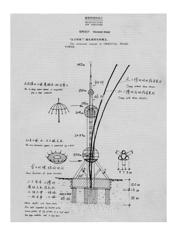 東方明珠廣播電視塔主體為多筒結構,由3根斜撐、3根立柱及廣場、塔座、下球體、5個小球體、上球體、太空艙、發射天線桅桿等構成,主體結構高350米,總高468米,總建筑面積達10萬平方米。