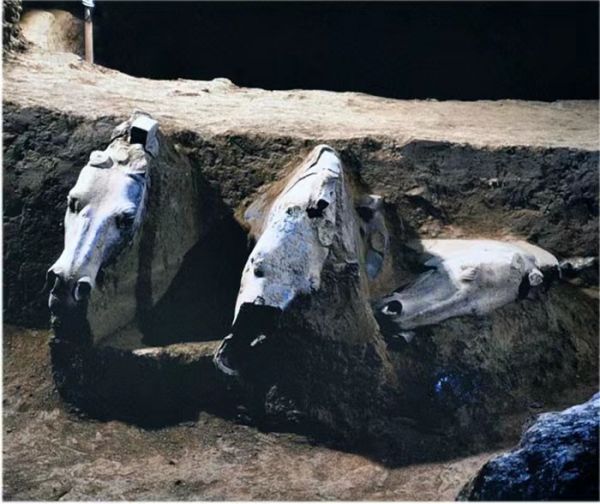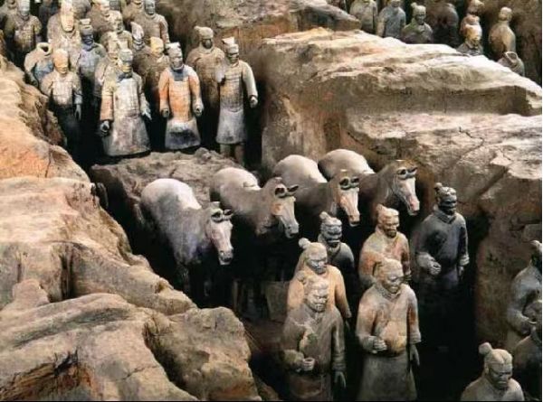 秦始皇陵兵馬俑陪葬坑坐西向東,三坑呈品字形排列。最早發(fā)現(xiàn)的是一號俑坑,呈長方形,坑里有8000余兵馬俑,四面有斜坡門道。一號俑坑左右兩側(cè)各有一個兵馬俑坑,稱二號坑和三號坑。
