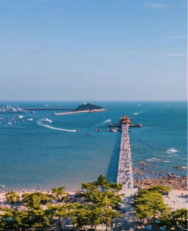 青島棧橋始建于清光緒十八年(1892年),是青島的重要標志性建筑物和著名風景游覽點 ,據說棧橋是青島第一個碼頭 最初所為海軍碼頭,德國侵占青島后改為貨運碼頭。青島棧橋全長440米,寬8米,鋼混結構,橋南端筑半圓形防波堤,堤內建有民族形式的兩層八角樓,名"回瀾閣","飛閣回瀾"被譽為"青島十景"之一。來青島,在棧橋上喂喂海鷗,在落潮的時候站在礁石上走近大海,這里比任何一個有海的城市都多了一份歷史的韻味,感受這里的空氣和大海的味道,自然的放慢腳步,在喧囂的市井生活里, 這里是難得的愜意時光。棧橋沿岸,就是棧橋公園,離車站不是很遠,來青島的第一站便是這里,從青島站步行到棧橋,也不需要太長的時間,漫步棧橋海濱,游人如織,微風徐徐,海鷗自由自在的飛過,游艇載著游客暢游碧海之中……感受青島的歷史韻味和美麗的風景,駐足停留于棧橋,碧海藍天,直到黃昏,夜幕降臨,每一個時刻都是美的享受。