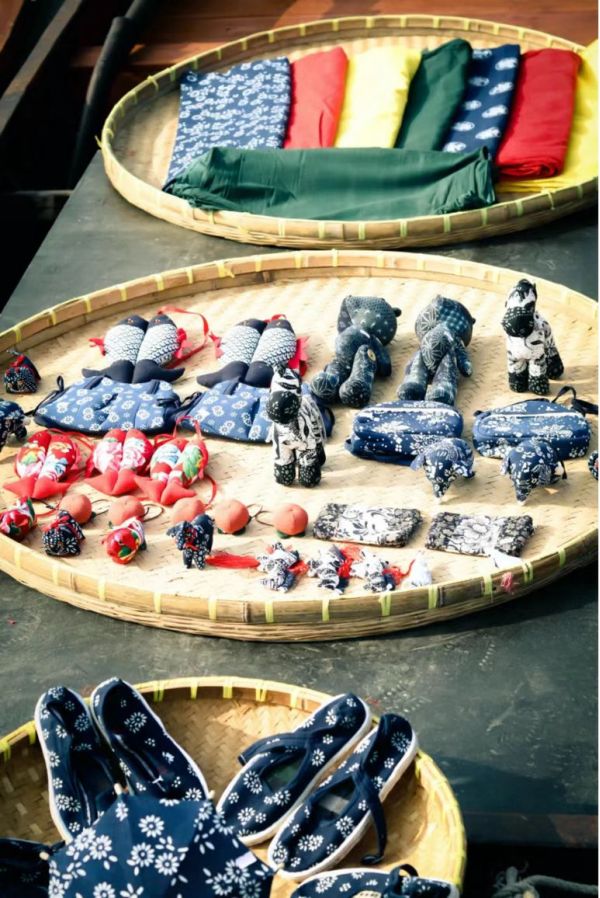 仔細逛一圈,能看到五花八門的小商品:藍印花布,布鞋,錦鯉掛墜……挑選一些心儀的小玩意,自己穿戴,或者送給家人、朋友,都是不錯的選擇。
