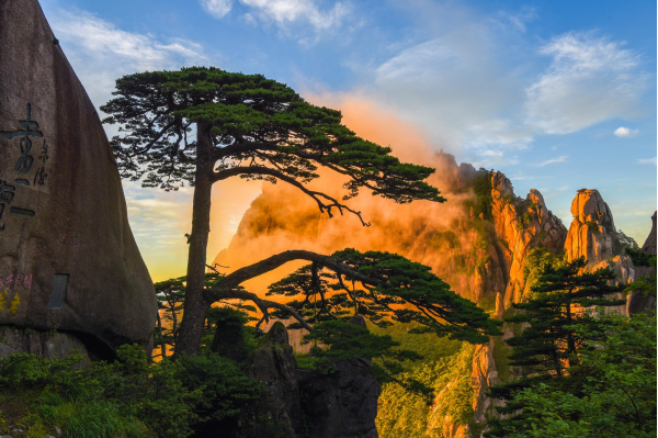 黃山古稱黟山,總占地面積約1200平方千米,它與長江、長城、黃河同為中華壯麗山河和燦爛文化的杰出代表,被世人譽為“人間仙境”“天下第一奇山”,素以奇松、怪石、云海、溫泉、冬雪“五絕”著稱于世,歷來享有“五岳歸來不看山,黃山歸來不看岳”的美譽,是中國十大名山之一、古代道教名山之一、中國最著名的山岳之一。黃山境內群峰競秀,有千米以上高峰88座,最美山峰蓮花峰與光明頂、天都峰并稱三大黃山主峰,海拔均逾1800米。