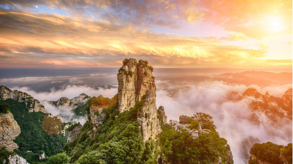 國內最美名山白石山地處太行山最北端,因山體遍布白色大理石而得名。白石山由100多座高低錯落、相對獨立的山峰組成,主峰海拔2096米,是一處以壯觀的峰林地貌為主的自然風景區,兼具了山岳景觀的、雄、險、幻、秀五大特點,屬于中國山岳景觀奇與險的杰出代表,位居中國名山排名前三。白石山風景區山體高大,少曲線,多棱角,高差大,密度大,有“三頂、六臺、九谷、八十一峰”,集峰林、怪石、絕壁、峽谷、森林、云海、佛光、長城等景觀于一體,地貌奇特,結構復雜,頗具觀賞游覽價值。