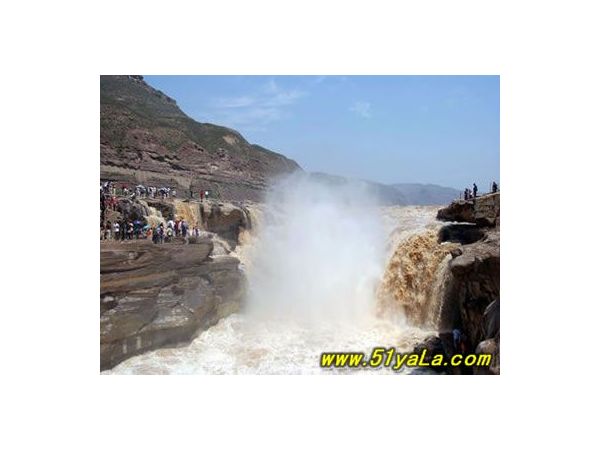 黃河象一條騰飛的巨龍,穿行在西北黃土高原的秦晉大峽谷中,當流經壺口時,寬約400米左右的河水突然收束一槽,形成特大馬蹄狀瀑布群。主瀑布寬40米,落差30多米,瀑布濤聲轟鳴,水霧升空,驚天動地,氣吞山河,為黃河第一大瀑布,也是我國僅次于貴州黃果樹瀑布的第二大瀑布。